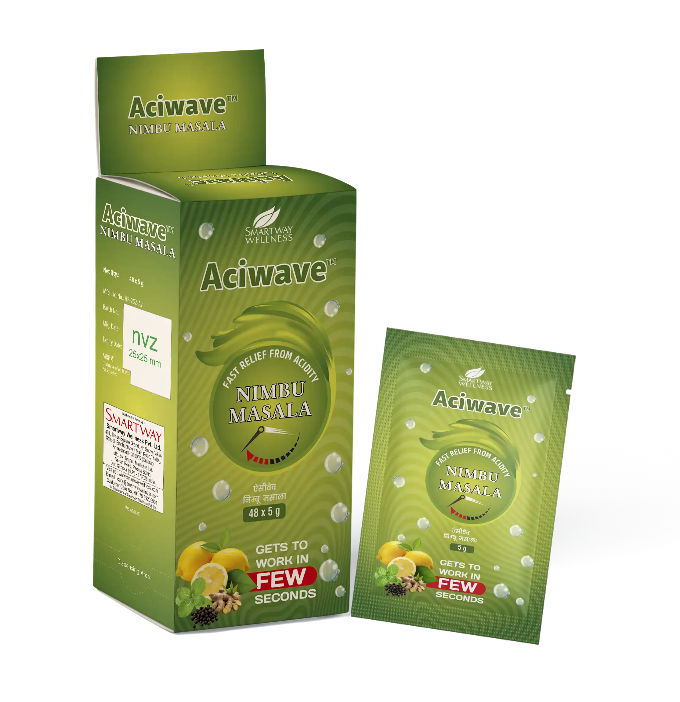 Aciwave Nimbu Masala Sachet 5 gm is a fast‑acting antacid powder formulated to provide instant relief from acidity, heartburn, indigestion, and sour stomach. It contains natural, soothing ingredients that help neutralize excess stomach acid and restore digestive comfort quickly.