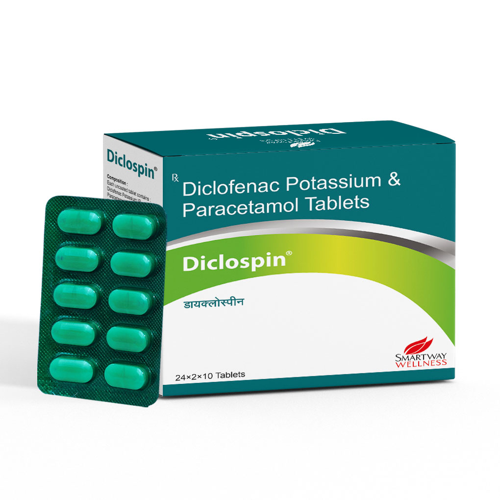 Diclospin Tab Green is a medication used to relieve pain and inflammation. It contains Diclofenac Sodium, a non-steroidal anti-inflammatory drug (NSAID) that effectively reduces pain, swelling, and inflammation associated with various conditions.